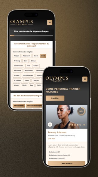 Das Matchmaking-Tool von Olympus Training unterstützt Kunden dabei, den passenden Personal Trainer basierend auf individuellen Präferenzen wie Preis, Ort und Sprache zu finden. Ich habe die Designentwürfe für den Präferenzen- und Ergebnisscreen erstellt sowie die Responsiveness für Smartphones gewährleistet.