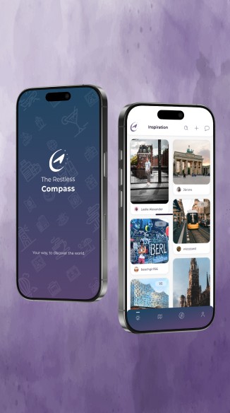 Nie mehr mit langer Urlaubsplanung rumplagen – das übernimmt die App "The Restless Compass". Eine komplette Brandidentity und das App-Design habe ich konzipiert und gestaltet. Die Farbwelt ist träumerisch und leicht und erinnert an erholsame Urlaubszeiten, auf die sich die Nutzer freuen können.